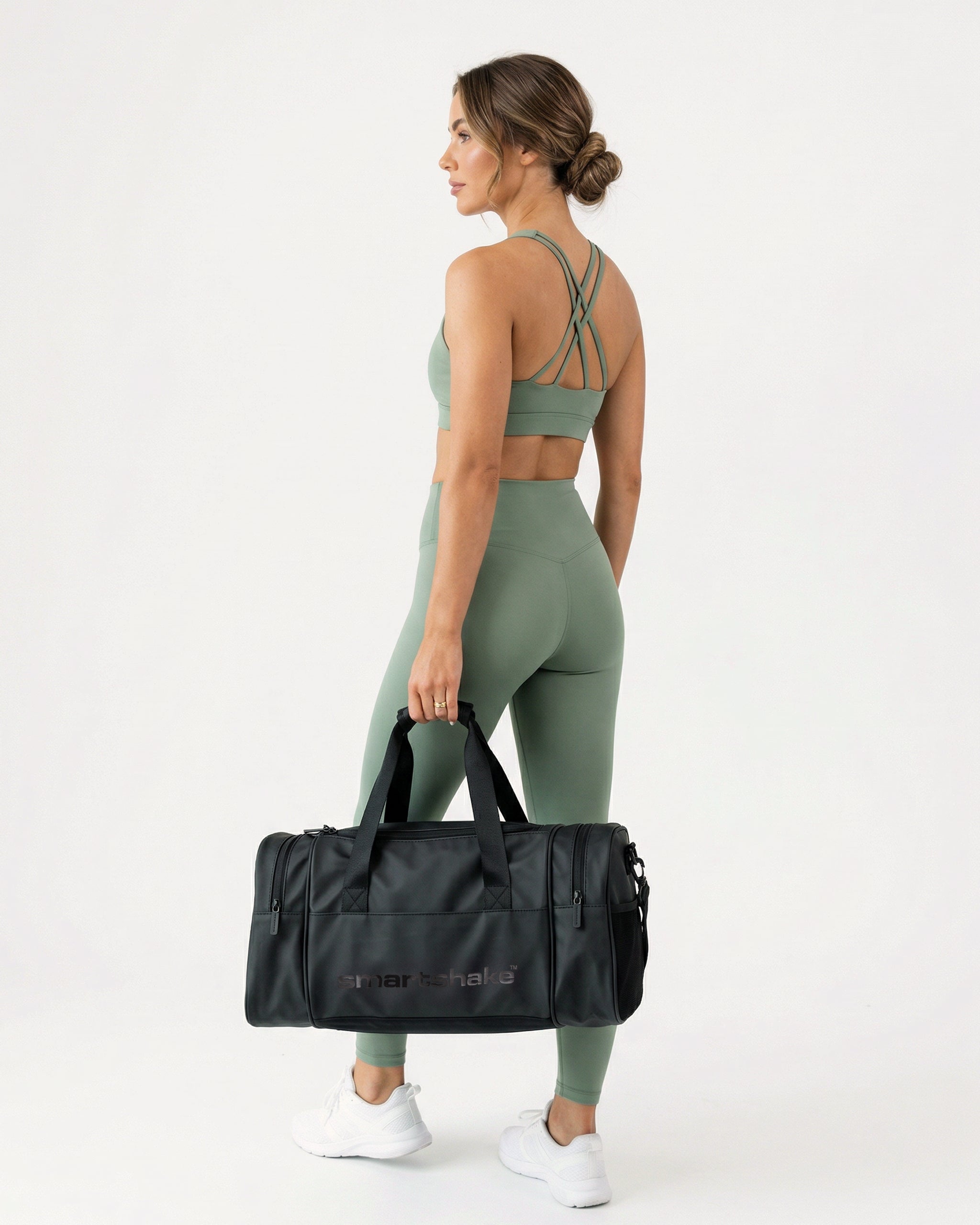 This 28L smart gym bag is designed for convenience, organization, and durability. It features two large side pockets—one with support straps for up to two shakers, the other with compartments for shower essentials.